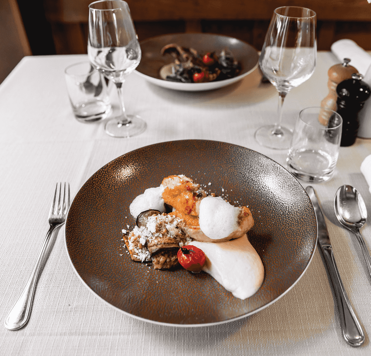 Menuen fremhæver sæsonbestemte, lokalt indkøbte ingredienser, der ekspertmæssigt omdannes til sofistikerede retter, som balancerer tradition med moderne teknik. Opmærksom betjening, et exceptionelt vinkort og en raffineret, men imødekommende atmosfære hæver hver besøg.